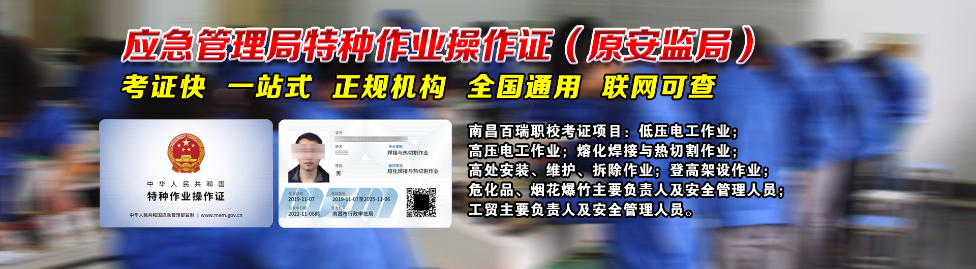 南昌百瑞职业培训技术学校创立于2003年。是经政府部门批准,江西省内规模较大,教学设施先进,专业培训:挖掘机驾驶员、装载机驾驶员、叉车驾驶员、起重机驾驶员和指挥、电工、电焊工、工程机械维修工、电商网络运营、健身教练、无人机及视频剪辑培训、特种设备安全管理、压力容器、气瓶充装、危化品生产(经营)单位主要负责人和安全员、烟花爆竹、登高作业等专业及培训的一所职业技术培训学校。 学校师资力量雄厚,具有中高级专业技术职称数十名。教学采用理论知识教学、模拟实操训练、实训操作训练的模式,实行“一对一”的教学方法,培训了大批动手能力强的技术人才,在省内享有盛誉。 学校多年来被评为优质学校、又被授予技能人才培训基地、特种作业人员考试基地、南昌市安全生产教育培训基地、校企合作人才培训示范基地、创业培训定点机构以及技能提升培训定点机构;同时是国家工程机械行业职业技能鉴定站;是江西省质监局叉车、起重机驾驶与指挥承训考证单位;是江西省安监局电工、电焊工承训考证单位;是江西省退役士兵职业教育和技能培训定点承训院校。 学校教学器材先进,拥有挖掘机、装载机、叉车、起重机、电工、电焊工、电商、健身等教学设备,同时配有模拟教学仪器,供学员实训使用。学员经培训考核合格后,颁发中华人民共和国《职业资格证》、《特种作业操作证》。 欢迎广大社会有志青年,复员军人来校培训,掌握一技之长,服务于社会,实现自己的人生梦想。